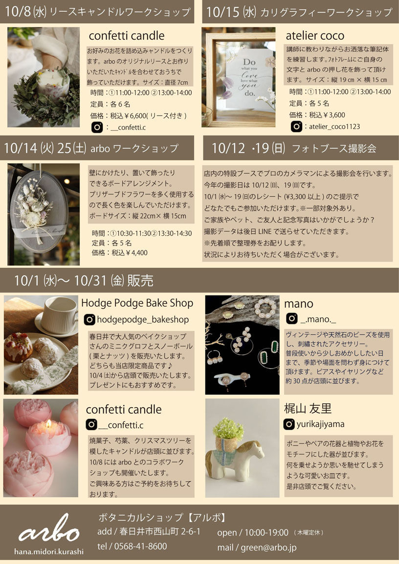 また、アルボのワークショップを始め、キャンドルやカリグラフィーの作家さんによるワークショップも行います。