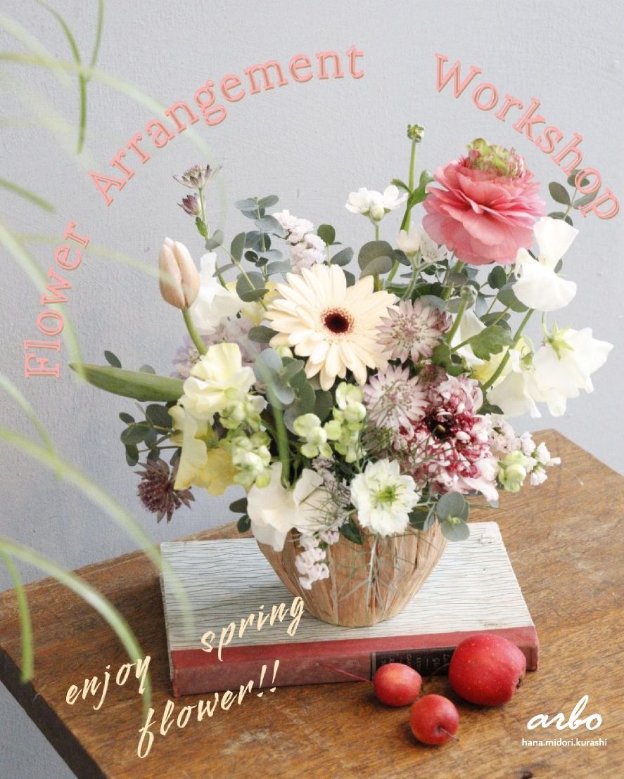 チューリップやラナンキュラス、スイートピーなど春のお花を使い春らしくふわっとしたアレンジメントを作ります